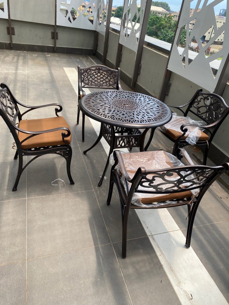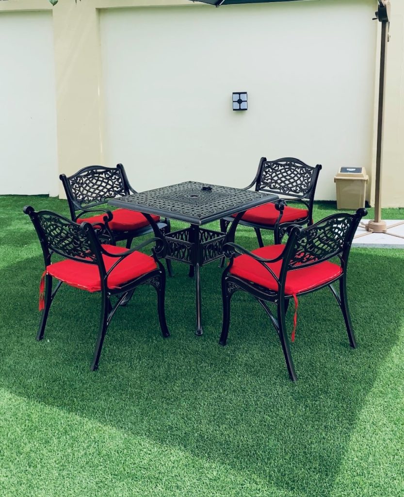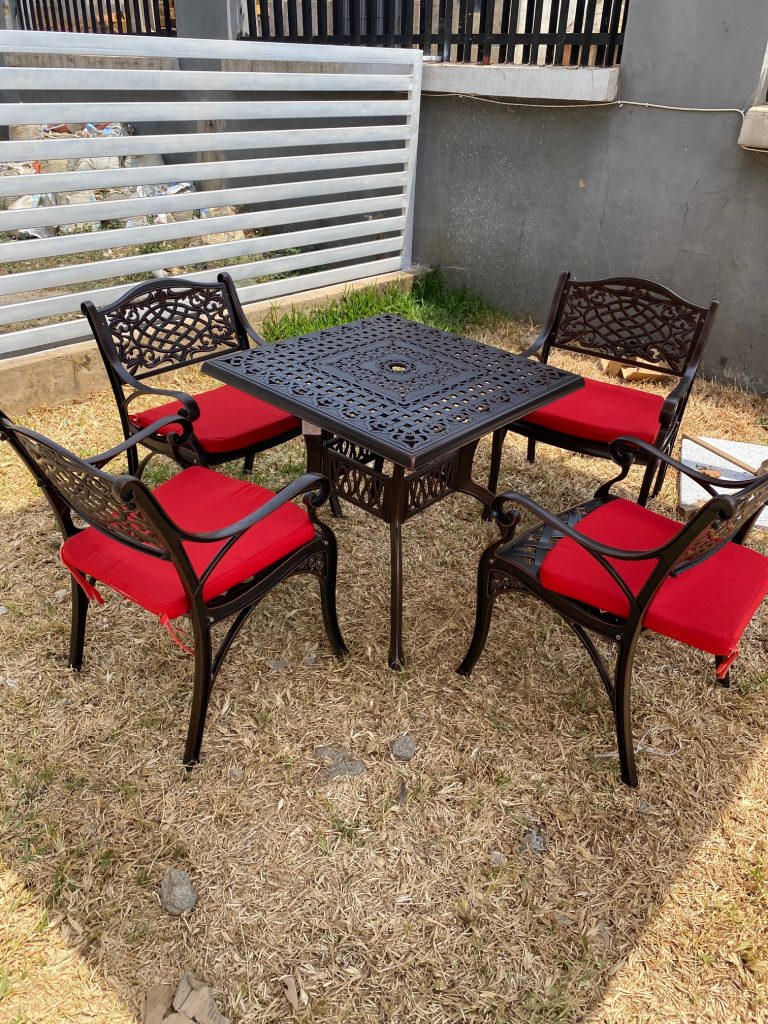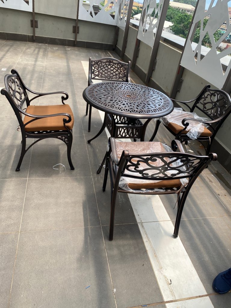 Cast Iron Construction: Grepatio 5 pieces patio dining set including 1 patio bistro table & 4 backyard dining chairs. Made from all-weather, rust-resistant cast iron. Lightweight for ease of mobility This outdoor Furniture aim to bring you years of enjoyment on patio, balcony, or other outdoor area. Long lasting use for whole family