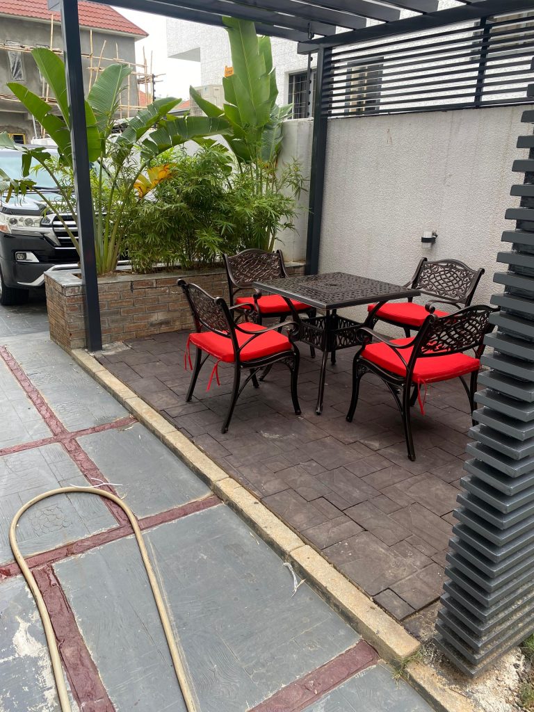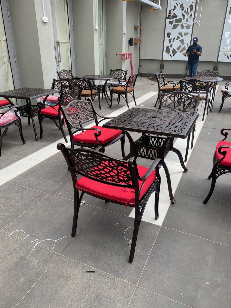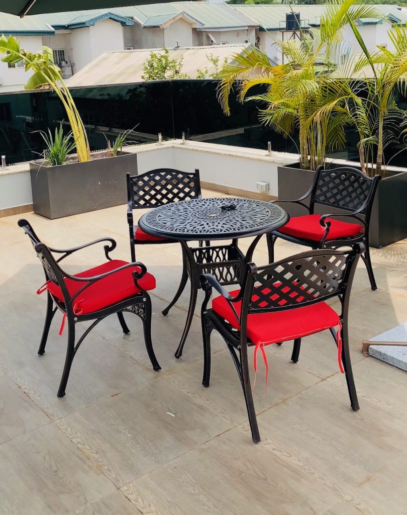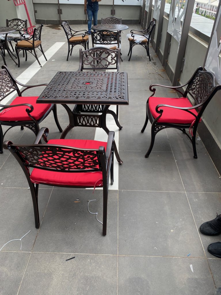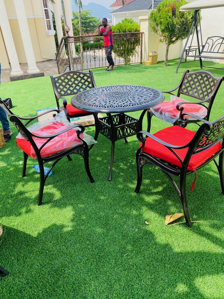 Cast Iron Construction: Grepatio 5 pieces patio dining set including 1 patio bistro table & 4 backyard dining chairs. Made from all-weather, rust-resistant cast iron. Lightweight for ease of mobility This outdoor Furniture aim to bring you years of enjoyment on patio, balcony, or other outdoor area. Long lasting use for whole family